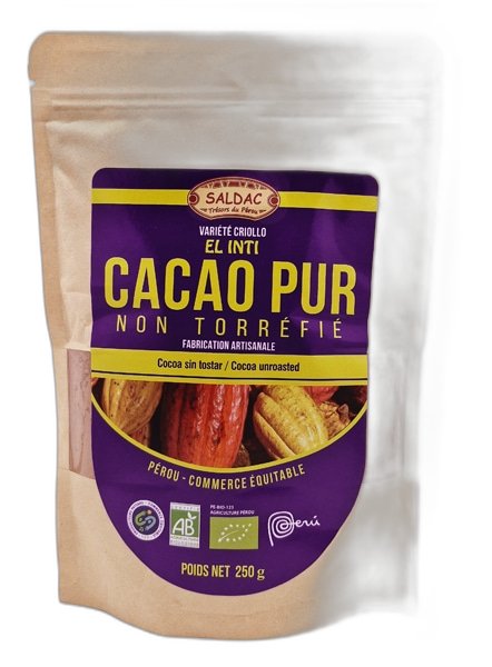 Saldac est une entreprise française pionnière du commerce équitable, engagée depuis de nombreuses années dans des partenariats directs avec des coopératives de petits producteurs en Amérique latine. Le cacao criollo cru que nous proposons provient de coopératives péruviennes certifiées biologiques, où les cacaoyers sont cultivés en agroforesterie, sous l’ombrage d’arbres fruitiers et forestiers. Cette méthode de culture traditionnelle préserve la biodiversité et les sols, tout en produisant un cacao d’une qualité gustative et nutritionnelle supérieure. La certification biologique garantit l’absence de pesticides chimiques et d’engrais de synthèse, tandis que le commerce équitable assure une rémunération juste aux producteurs.